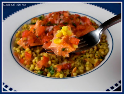 Both dishes go together quickly and easily and the colorful combination of the orangey-pink salmon, red tomatoes and green herbs, combined with the sunny yellow saffron orzo (or in this case I used my favorite Trader Joe's Harvest Grains Blend, full of Israeli couscous, orzo, red quinoa and split garbanzo beans), is gorgeous. Served with a simple green salad it makes a healthy dinner that says I love you with great flavor and plenty of Omega-3 fatty acids, lean protein, fiber, and assorted vitamins and minerals--good for the the body and the heart. Now That's Amore! ;-)
